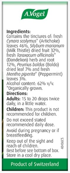 Contains the tinctures of: fresh Cynara scolymus* (Artichoke) leaves 46%, Silybum marianum (Milk Thistle) dried fruit 32%, fresh Taraxacum officinalis* (Dandelion) herb and root 12% Peumus boldus (Boldo) dried leaf 7% and fresh Mentha piperita* (PepperminDirections: