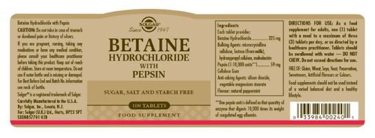Betaine Hydrochloride with Pepsin contains the gastric acidifier Betaine Hydrochloride with Pepsin, an enzyme which breaks down proteins.
